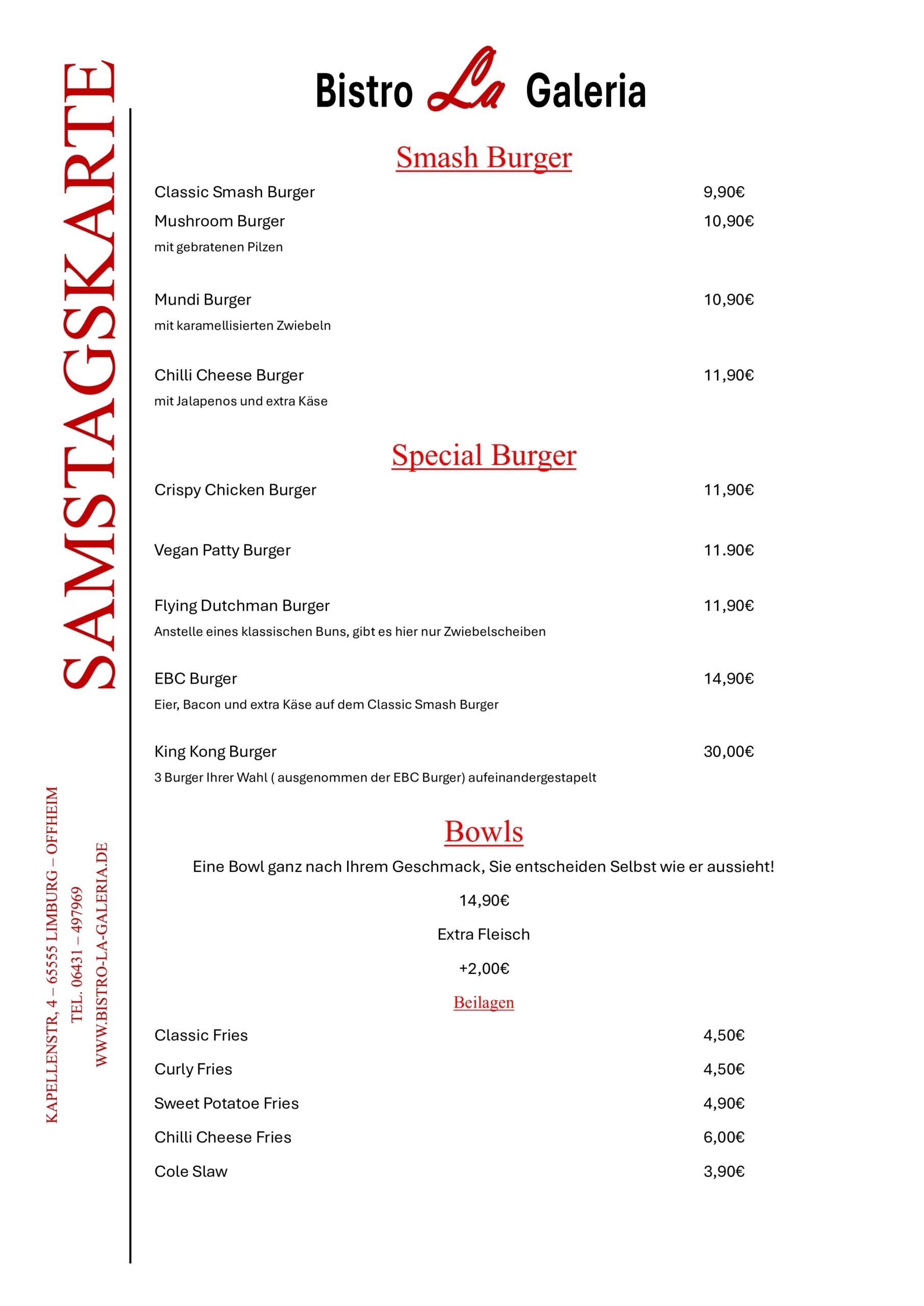 | Chili Cheese Pommes (g/2) | 5,60€ |