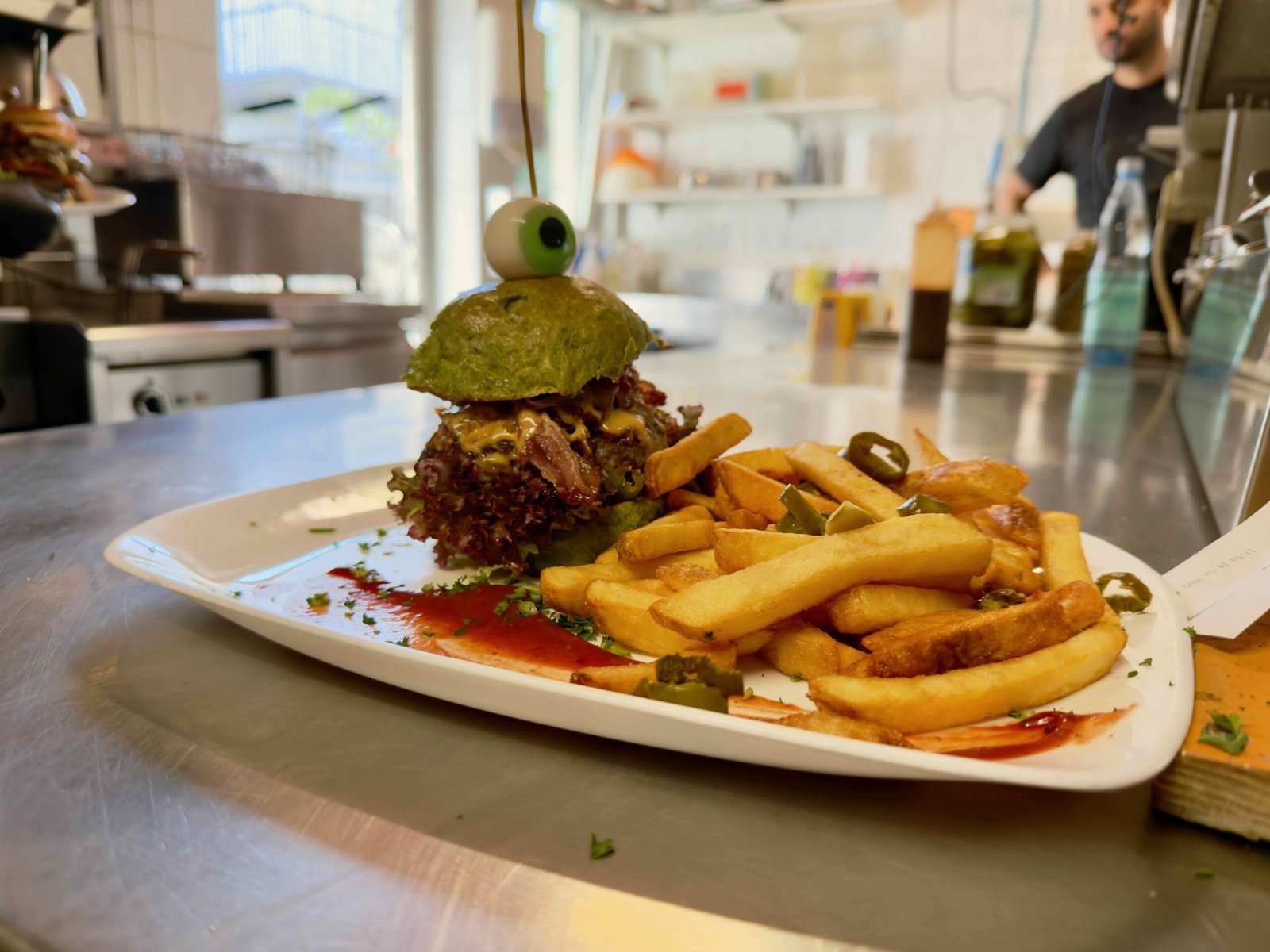 | „Wilde Hilde“ Burger 🌱 Vollkorn-Dinkel Bun / Veganes Patty / Jalapenos / V – Cheddar / Alabama White BBQ Soße (a/f/2) |